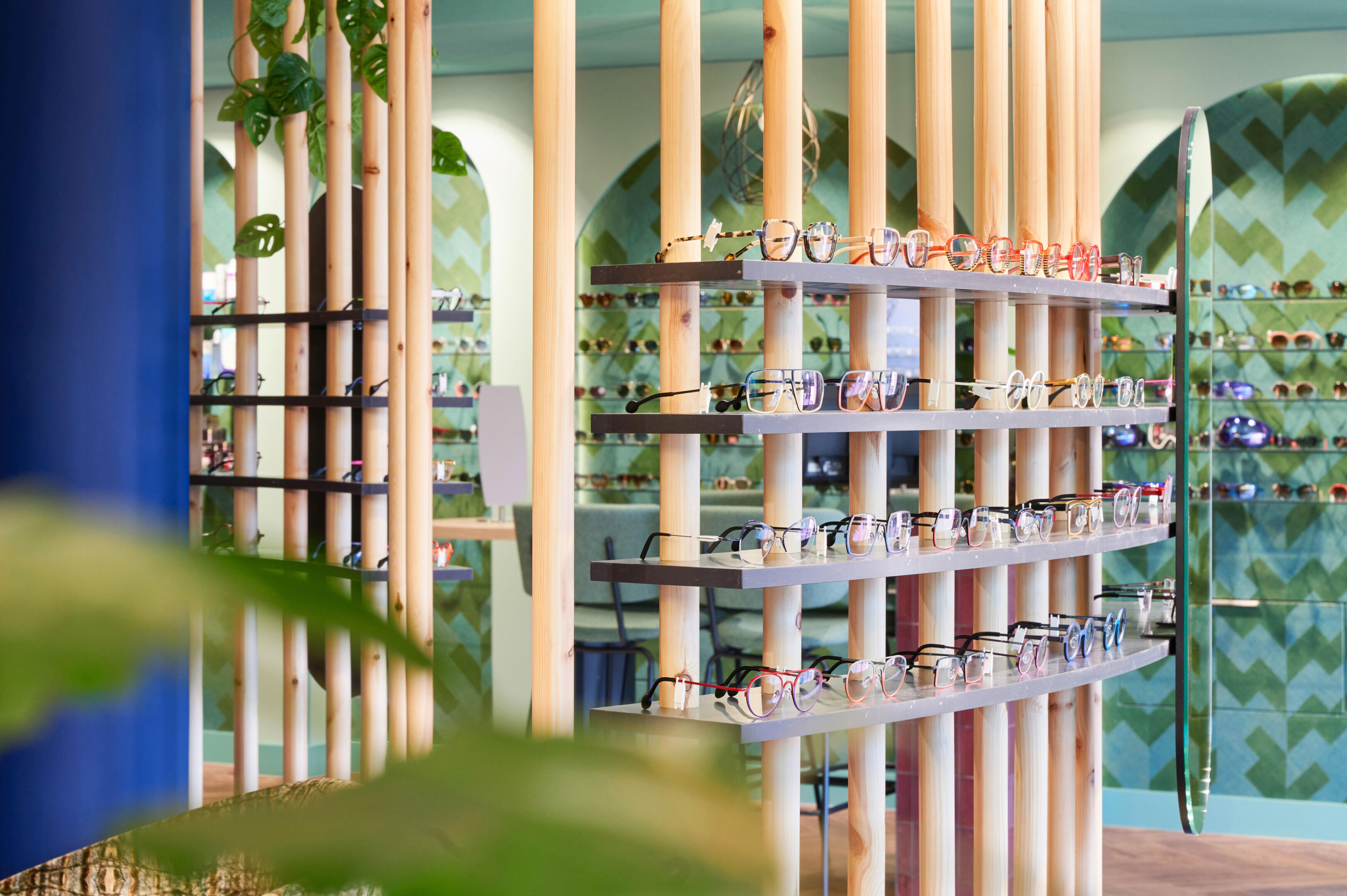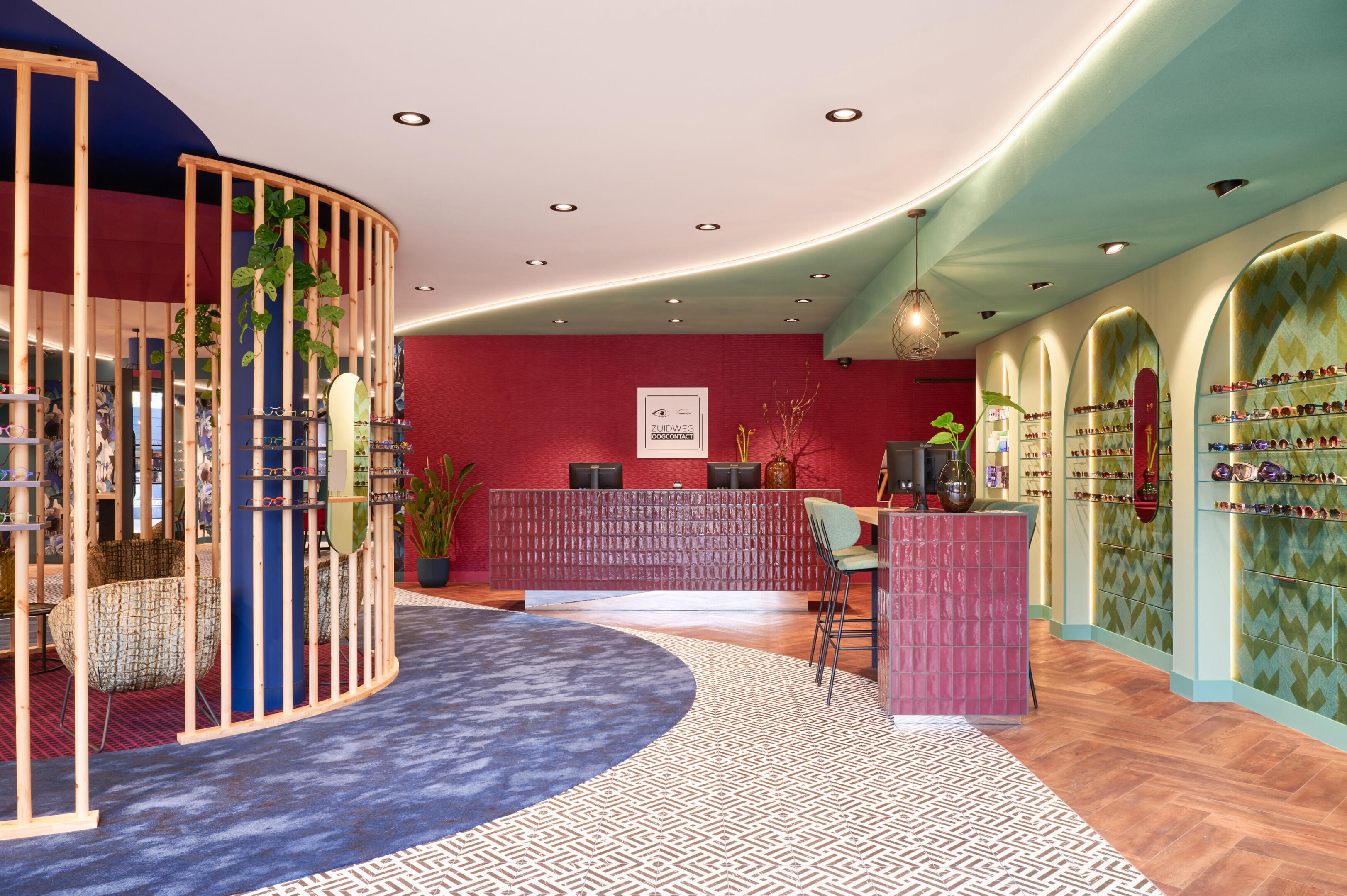 Zuidweg Oogcontact’s new location in Papendrecht features a completely redesigned interior that feels bold, hotel chic and warmly welcoming. Interior designer Lisa Mulder drew inspiration from the bird of paradise flower and the peacock feather, resulting in a colourful concept with surprising contrasts. The black and white tiles blend seamlessly into carpet with the exact same print, developed together with LEOXX and printed by Prints van Oranje. The soft frisé carpet shows the graphic pattern with crisp precision and, thanks to use class 33, is perfectly suited for intensive retail environments.