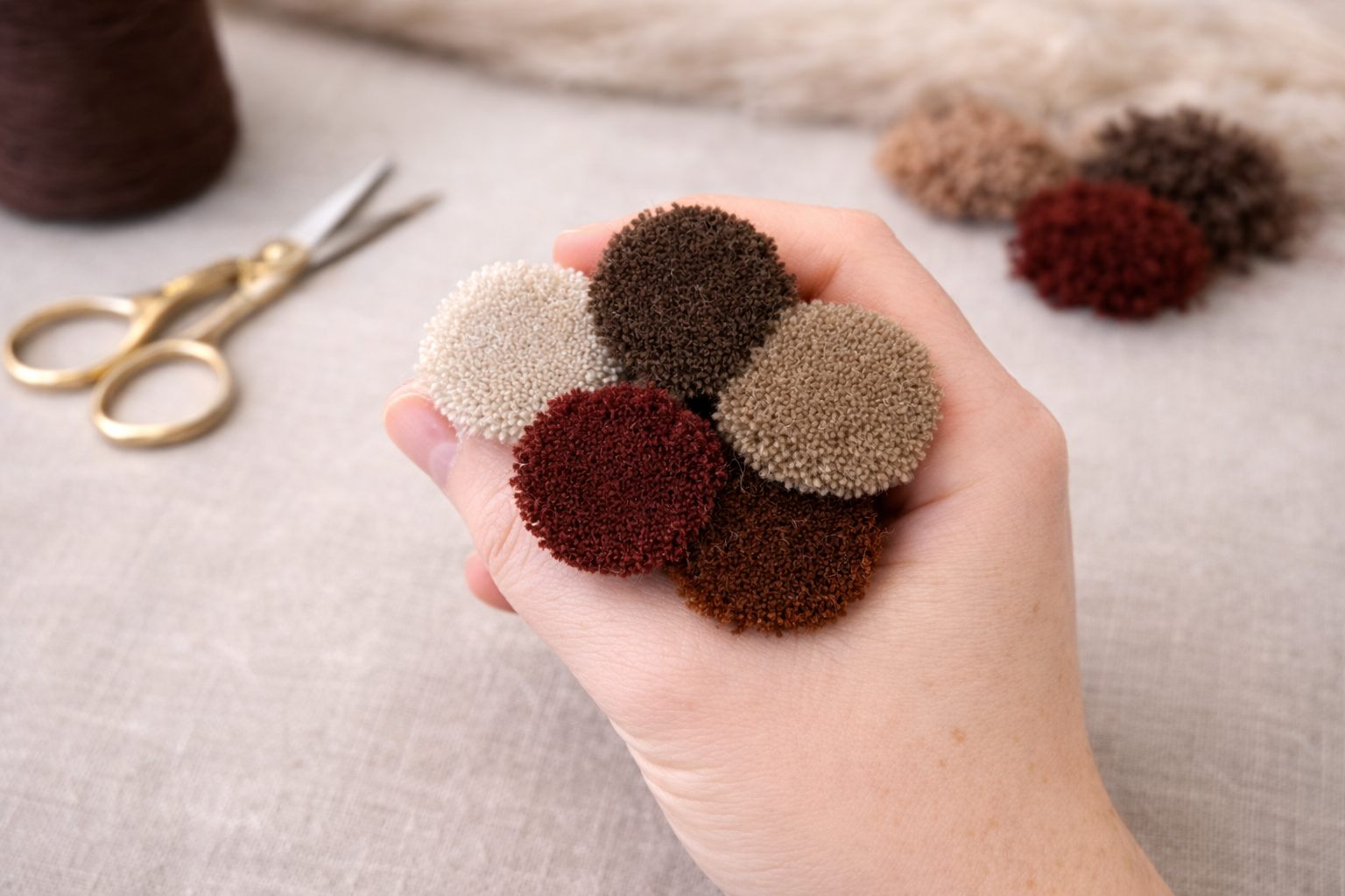 Elke ontwikkeling van Van Besouw begint bij de materiaal keuze. Voor robot tufting werken wij uitsluitend met fijn kamgaren, gesponnen uit de langste en meest verfijnde wolvezels. Elke draad wordt met zorg voorbereid. Kortere vezels en natuurlijke onregelmatigheden worden uitgekamd, waardoor een gladde en gelijkmatige structuur ontstaat die het oppervlak zijn rustige en verfijnde uitstraling geeft. Kamgaren voelt zacht aan, maar is van nature sterk. Het is slijtvast, veroudert op elegante wijze en reflecteert het licht met een subtiele glans. Het fijne garen maakt een hoge mate van precisie in structuur mogelijk en geeft ieder getuft karpet diepte en definitie.