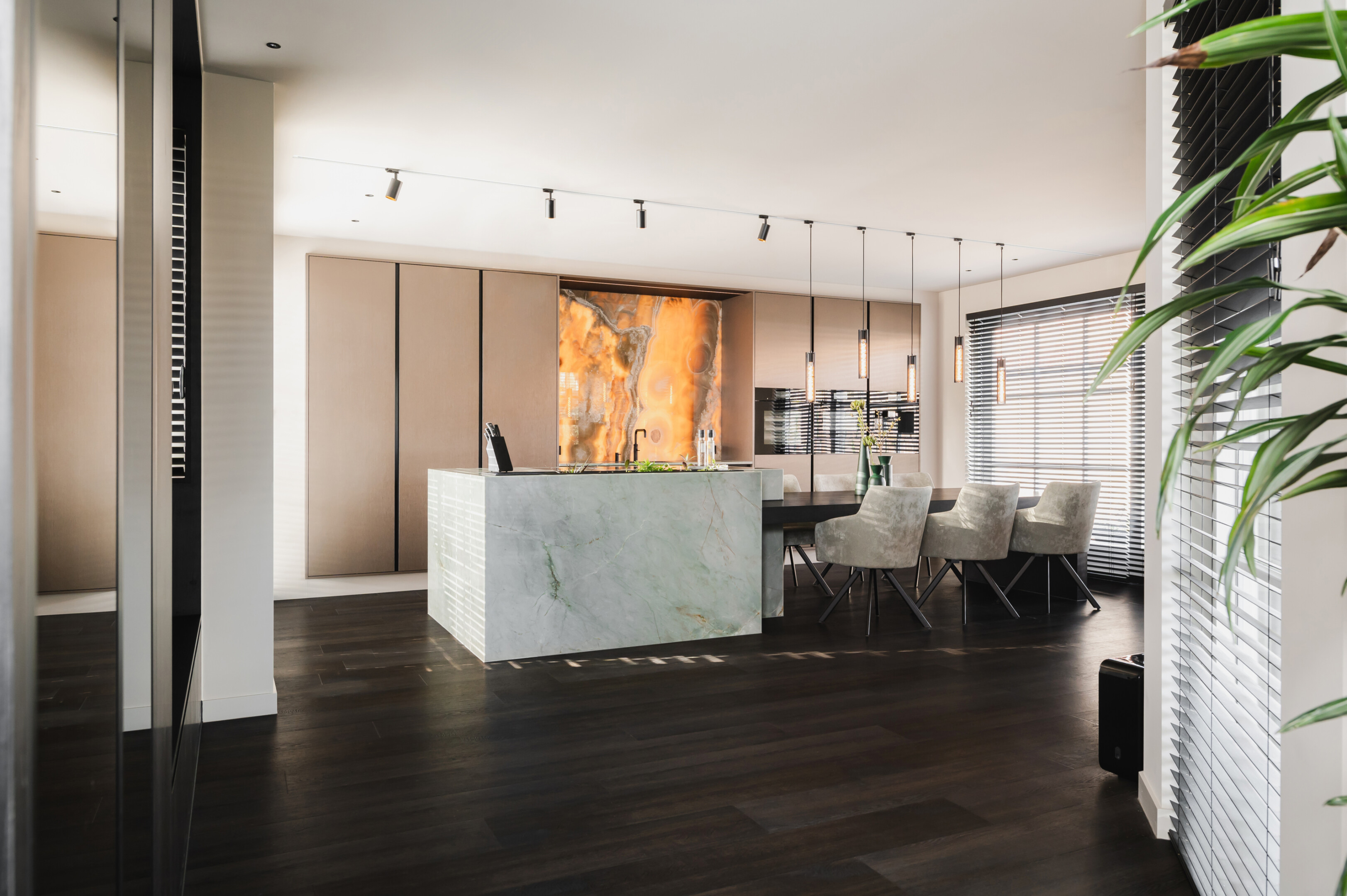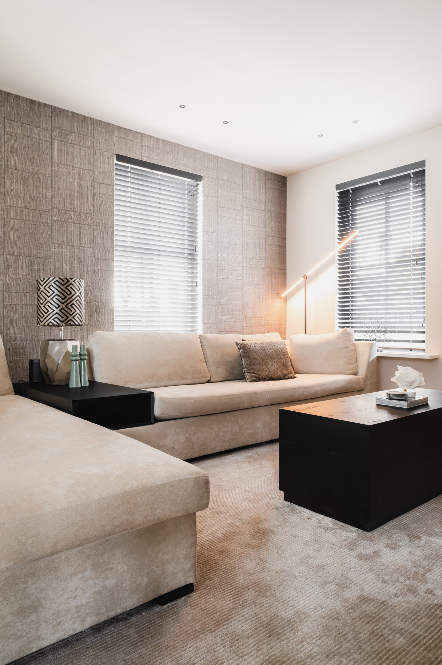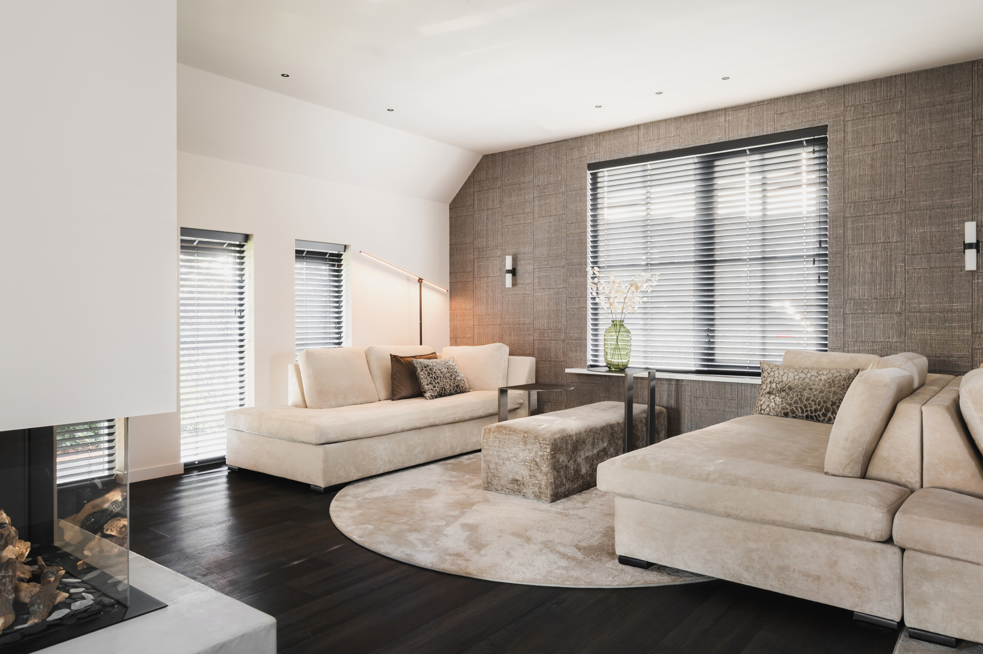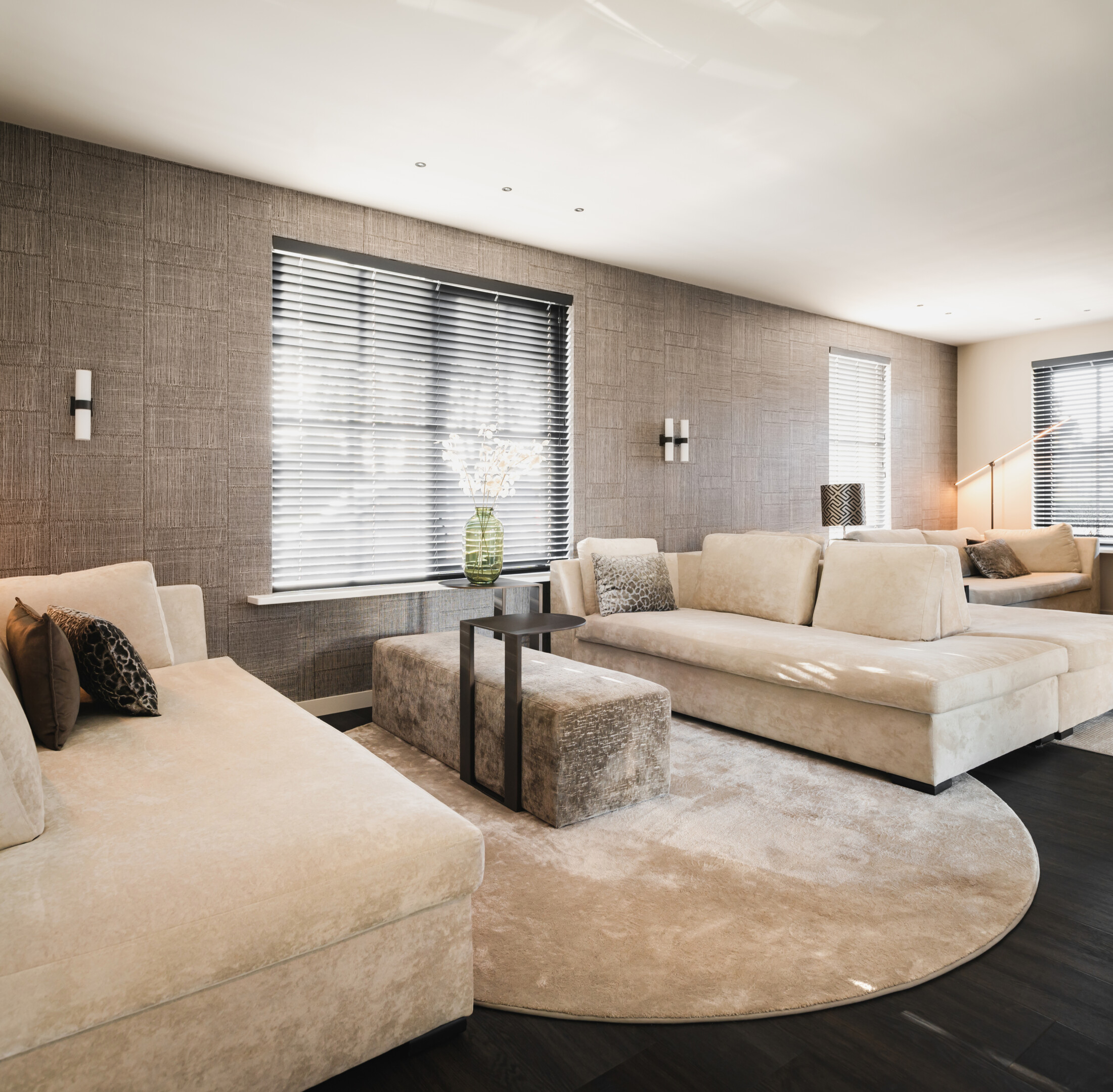 Een volledige transformatie heeft plaatsgevonden in dit riante woonhuis, waarbij het interieur is vernieuwd met een verfijnde hotel chique stijl. De op maat gemaakte tv-hoek en keuken voegen een perfecte touch van exclusiviteit toe aan de algehele esthetiek. De keuze voor een donkere Therdex pvc vloer in lange planken is naadloos geïntegreerd in het interieur, waardoor een gestroomlijnde en ruimtelijke sfeer ontstaat die perfect aansluit bij de stijl van de woning. De karpetten uit de Van Besouw Allure collectie voegen klasse en stijl toe aan het totaalontwerp.